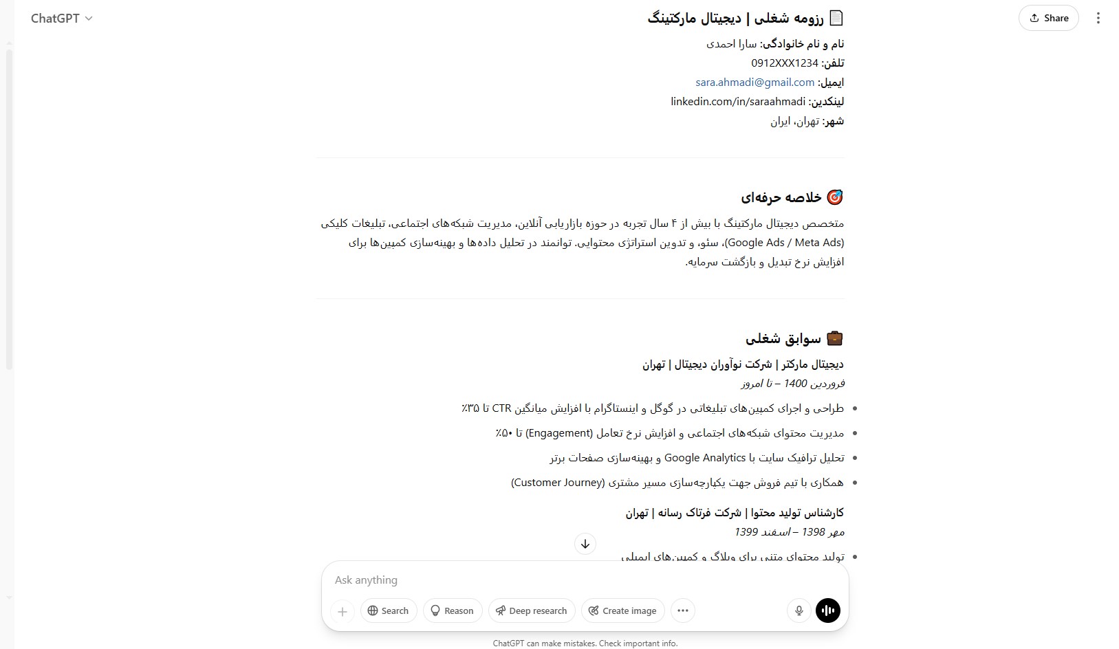 ما از ChatGPT خواستیم رزومهای برای عنوان شغلی «دیجیتال مارکتینگ» بسازد و تصویر زیر بخشی از نتیجه است.
