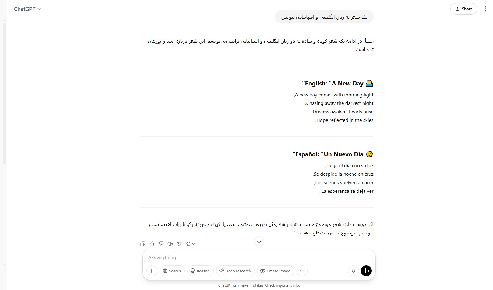 برای مثال، زمانی که از ChatGPT خواستیم شعری به زبان انگلیسی و اسپانیایی بنویسد، نتیجهای خلاقانه و قابلقبول ارائه کرد که بخشی از آن را در تصویر زیر مشاهده میکنید.