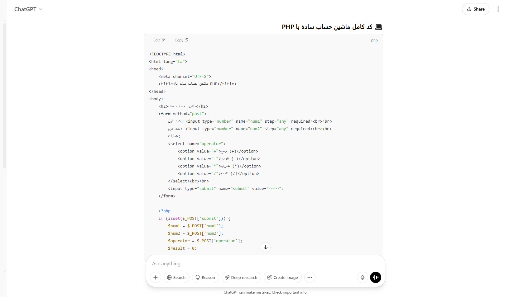 علاوهبر این، میتوانید از ChatGPT بخواهید کدی را از پایه برایتان بنویسد. بهعنوان نمونه، از این هوش مصنوعی درخواست کردیم یک ماشینحساب ساده با زبان PHP طراحی کند که بخشی از نتیجه آن را در تصویر زیر میبینید.