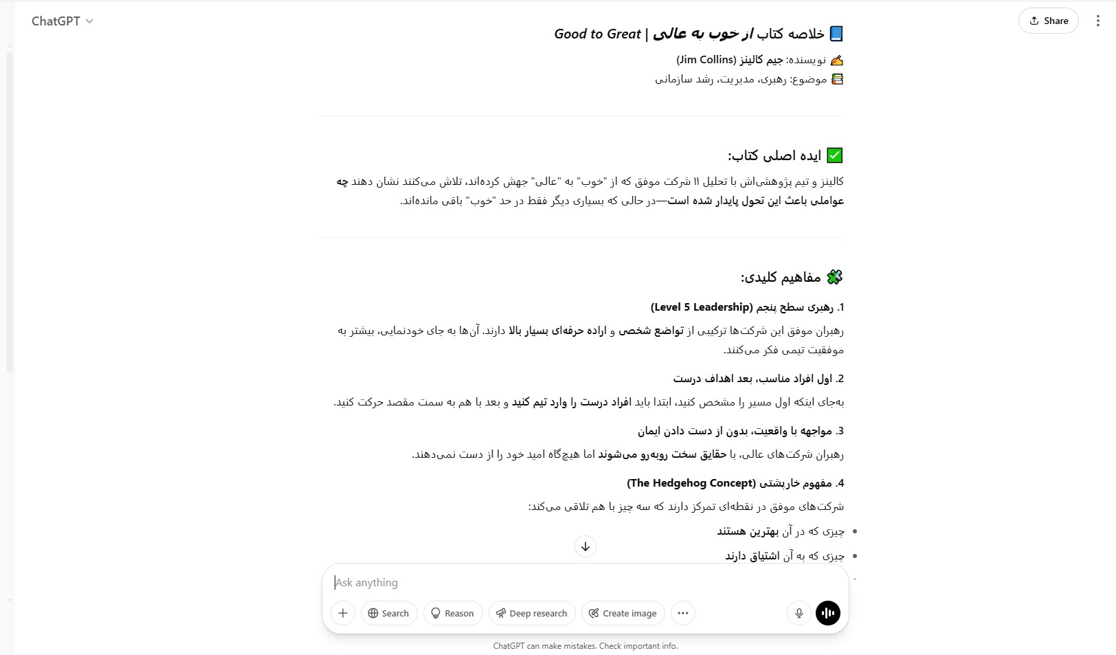 از ChatGPT خواستیم خلاصهای از کتاب «از خوب به عالی / Good to Great، نوشته جیم کالینز» را برای ما بنویسد و تصویر زیر بخشی از نتیجه است.