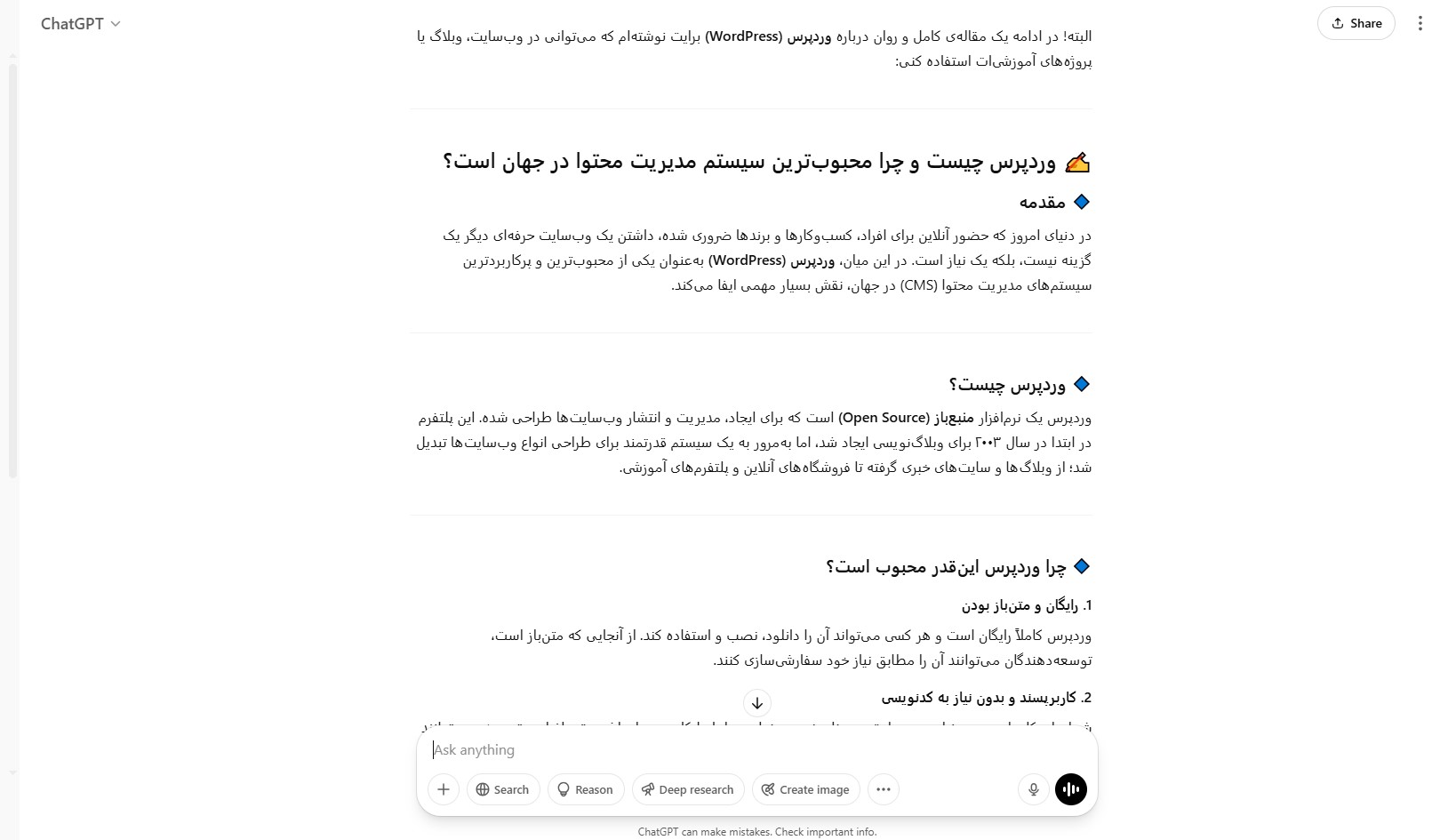 از ChatGPT خواستیم مقالهای درباره وردپرس برای ما بنویسد و تصویر زیر بخشی از نتیجه است.